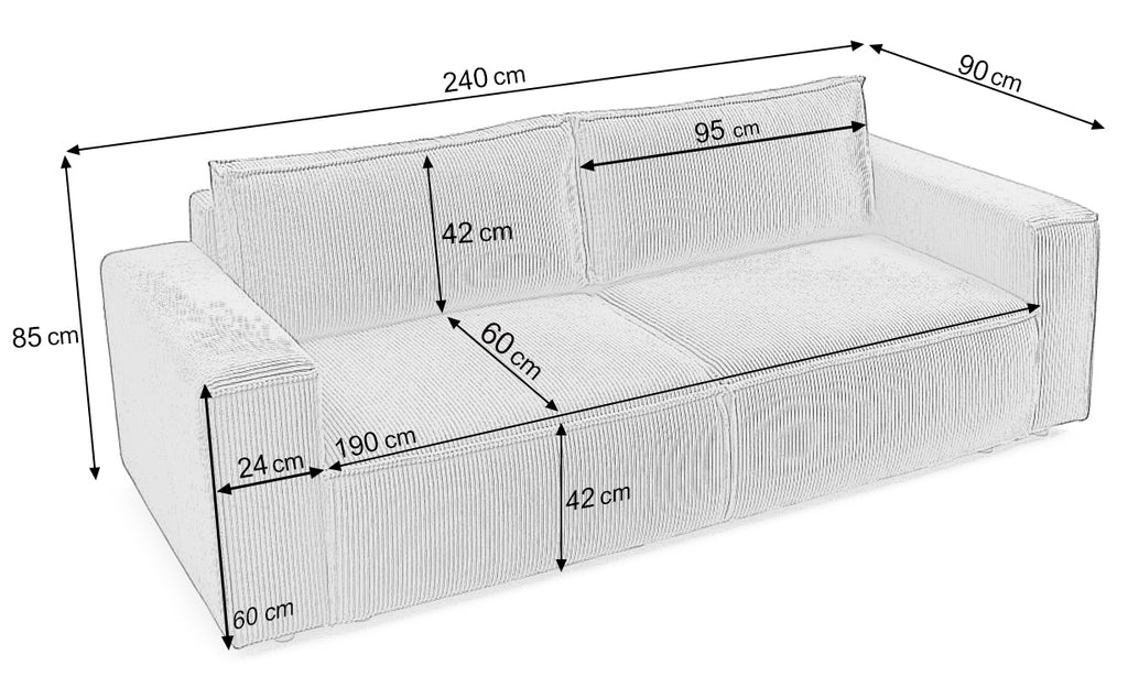 • Adâncimea șezutului: 60 cm cu perne, 75 cm fara perne