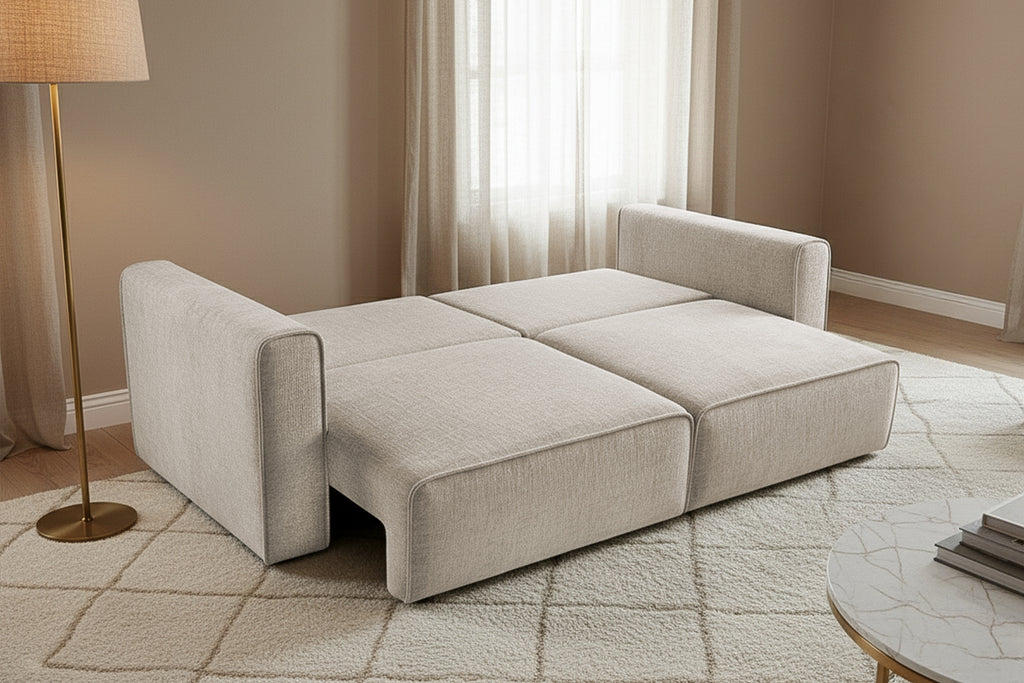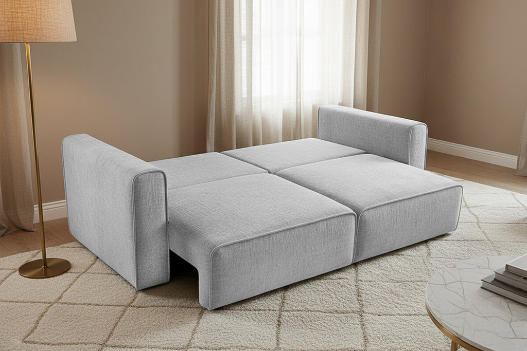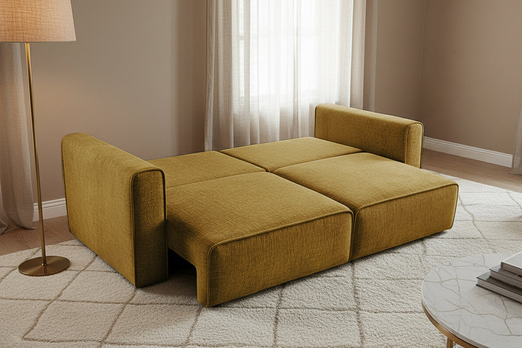 Extensibil și cu o suprafață generoasă de dormit, devine fără efort un loc de odihnă sau de primit oaspeți. Și pentru că vine în șase nuanțe elegante — de la verde sofisticat și alb perlat, la amber cald sau gri urban — îl poți personaliza după starea ta, sezon sau lumină.
