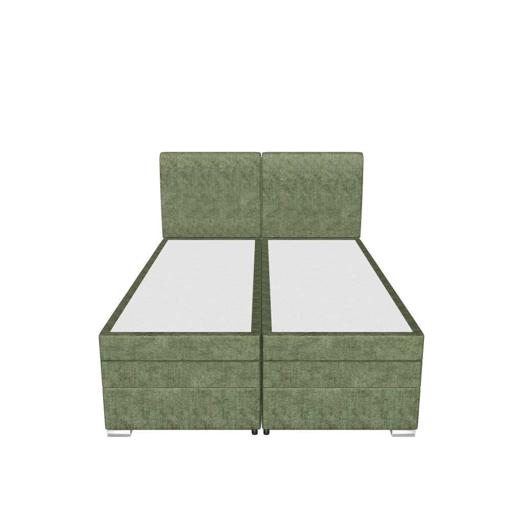 Patul este tapițat cu stofă moale și plăcută la atingere, este prevăzut cu două lăzi de depozitare, iar salteaua și topper-ul sunt incluse.