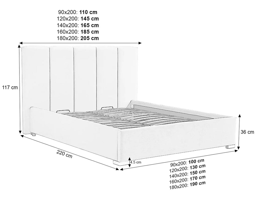 • Ladă depozitare:  200x140x15 cm (pentru pat 140x200 cm)