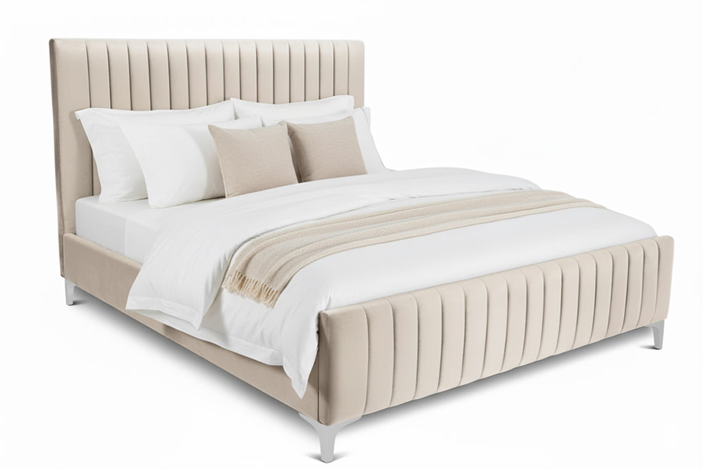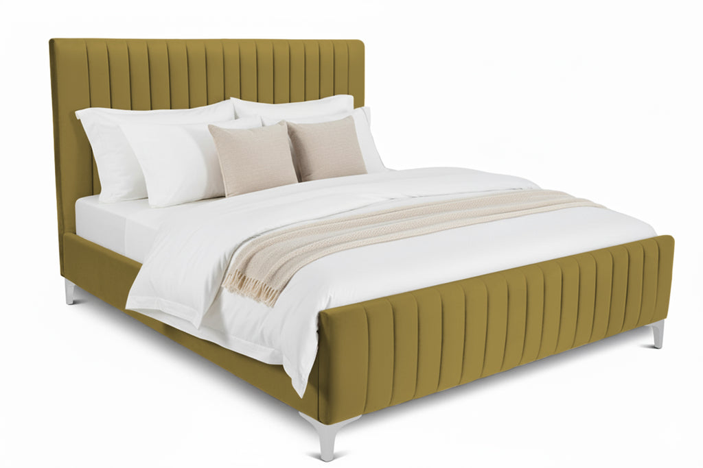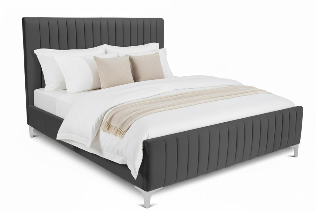 Patul este dotat cu o tăblie de dimensiuni generoase, tapițată cu stofă Velluto moale, tip velur. Aceasta nu doar că oferă un luciu elegant și rafinat, dar asigură și o senzație plăcută la atingere. Designul său sofisticat va adăuga cu siguranță un plus de stil dormitorului.