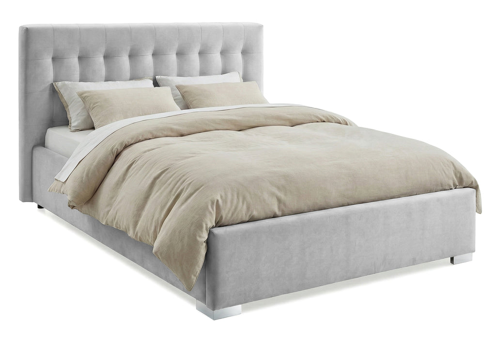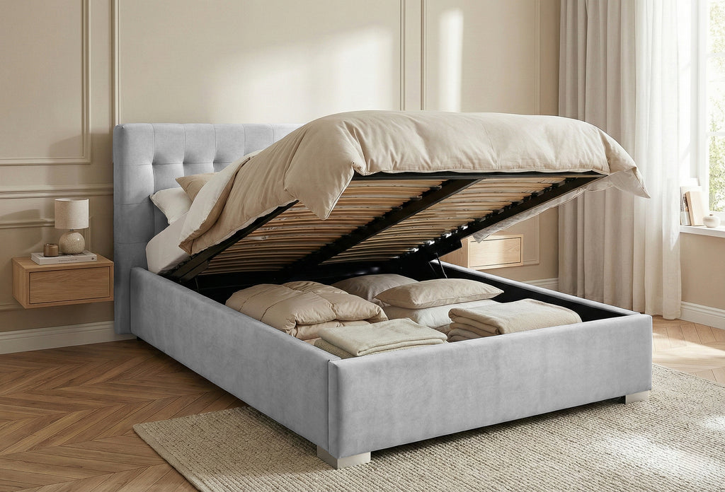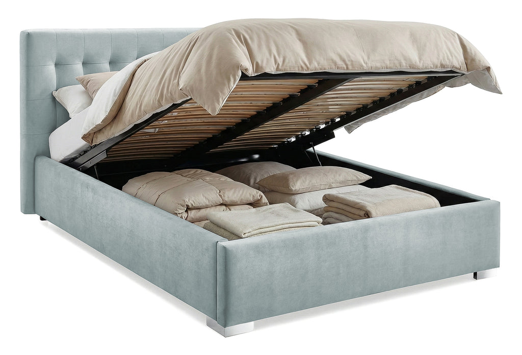 Patul este tapițat cu material catifelat și plăcut la atingere, este prevăzut cu somieră rabatabilă ce poate susține până la 200 kg și beneficiază de un spațiu generos de depozitare.