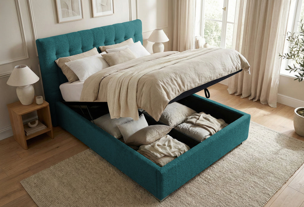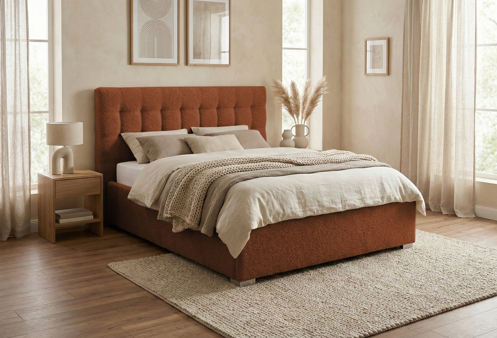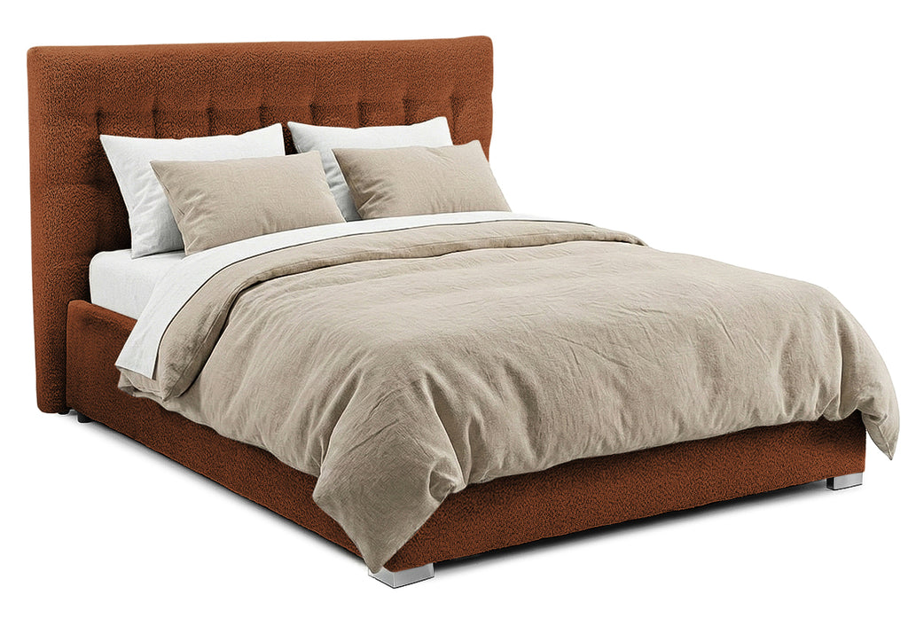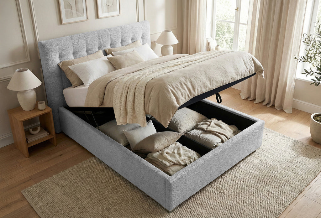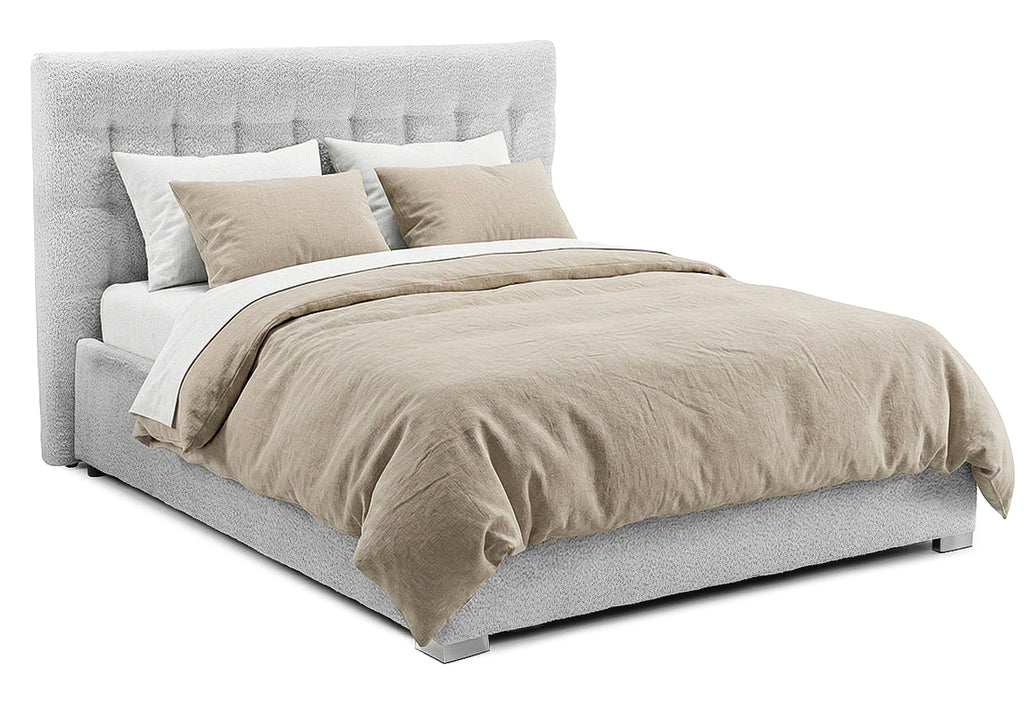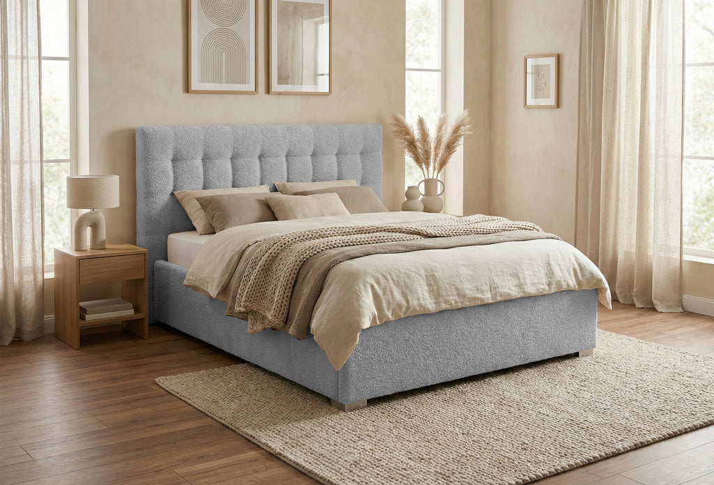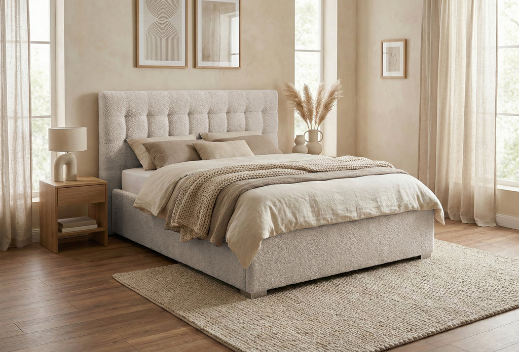 Structura patului este construită dintr-un cadru solid din PAL și lemn masiv de brad, conferind durabilitate și stabilitate. Tapițeria premium, disponibilă în două opțiuni elegante – Anthology Boucle, cu o textură moale și aspect rafinat, sau Eden, un material structural deosebit, fin și plăcut la atingere – adaugă un plus de rafinament și stil. Ambele variante de tapițerie sunt certificate OEKO-TEX® Standard 100, asigurând siguranța și calitatea materialelor utilizate.