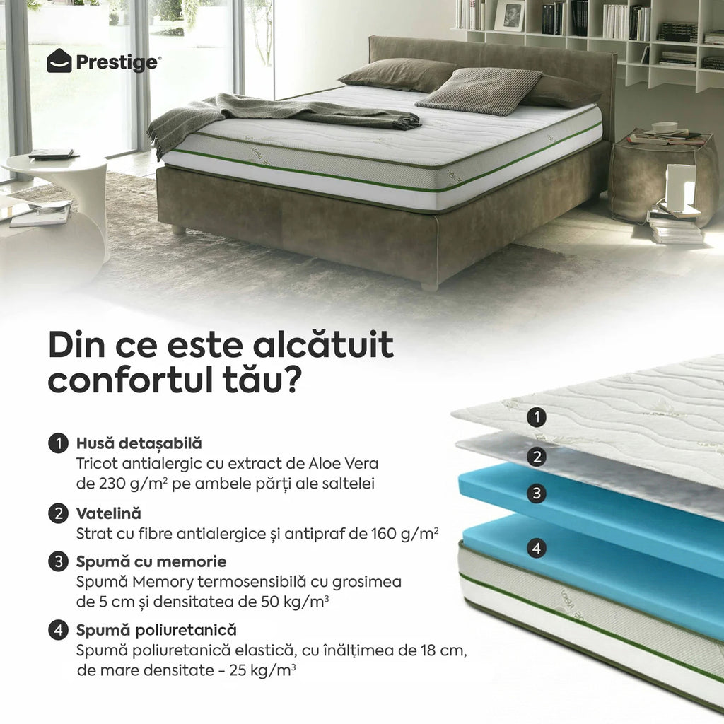 Saltea ALOE VERA HYGENE BIO MEMORY 18+5, 7 zone de confort, husă detașabilă, superortopedică, PrestigeHome