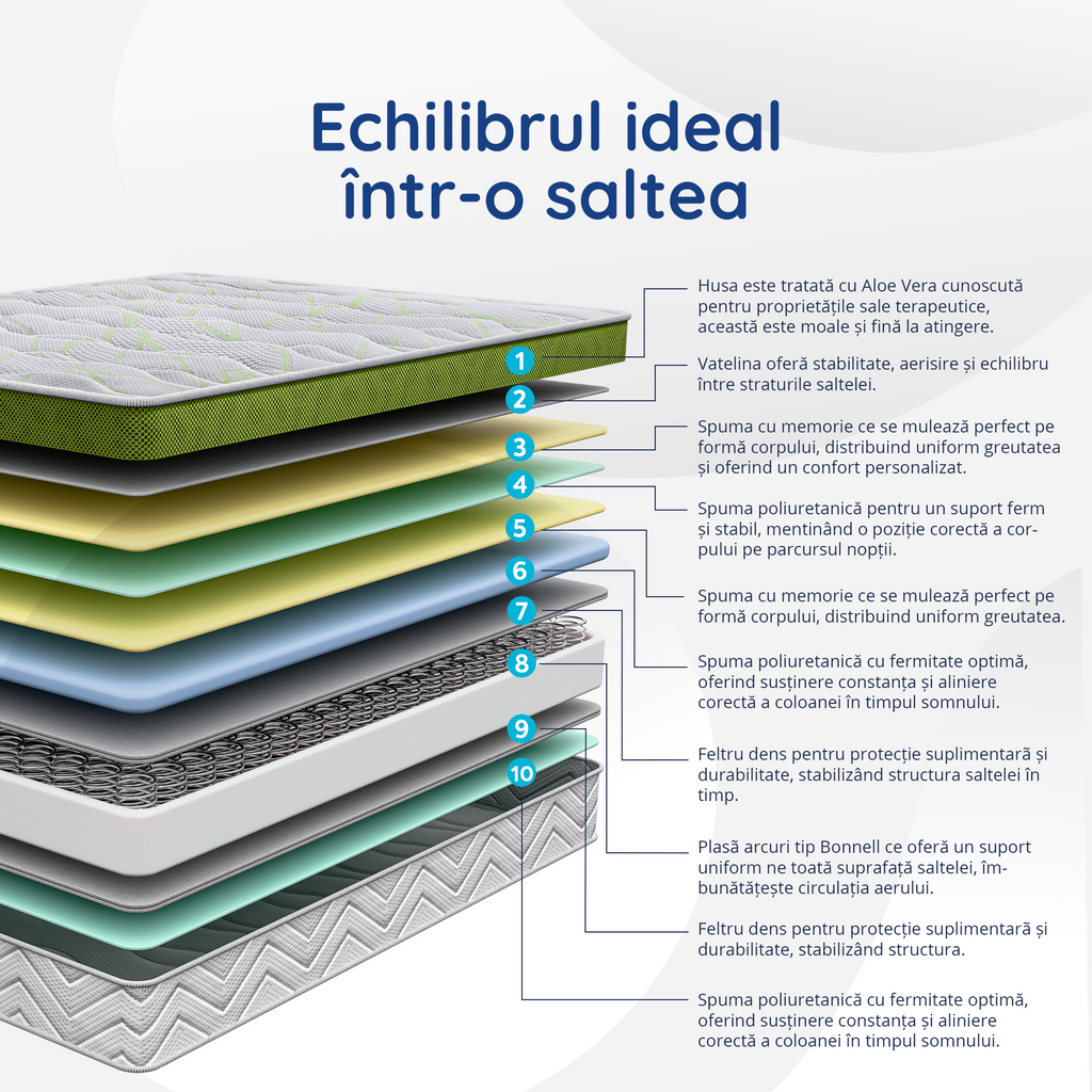 Structura sa hibridă (arcuri + spumă poliuretanică + spumă cu memorie) oferă echilibrul ideal între susținere, confort şi rezistență.