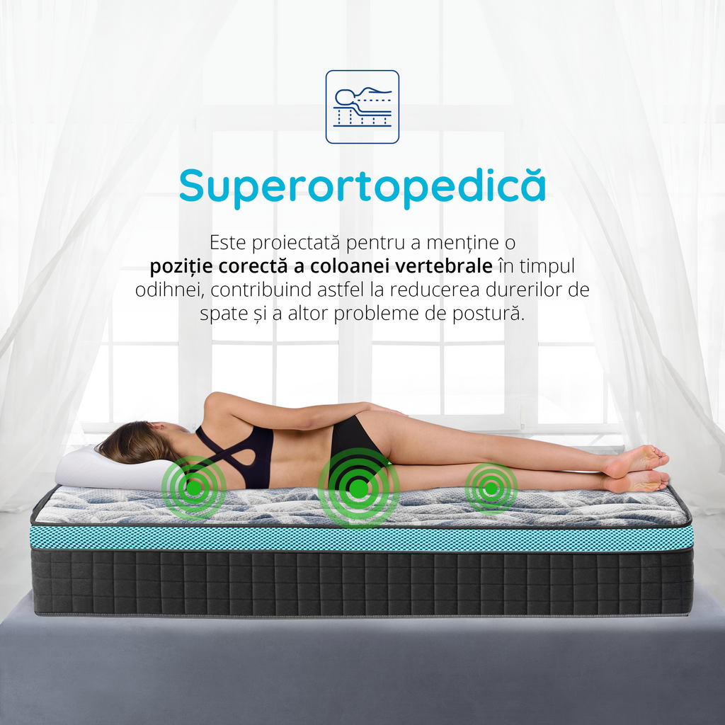 Stratul superior de spumă cu memorie se mulează perfect pe forma corpului, distribuind uniform greutatea și reducând punctele de presiune. Oferă un confort personalizat și sprijină alinierea corectă a coloanei vertebrale.