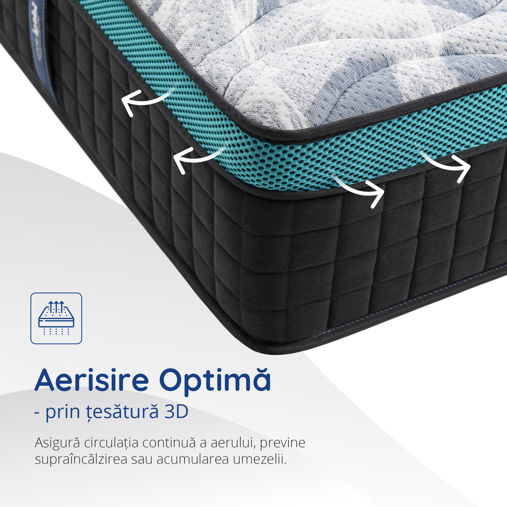 Structura sa cu arcuri împachetate individual (Pocket Springs) asigură susținere independentă pe 5 zone de confort, adaptându-se precis formelor corpului și reducând presiunea asupra punctelor sensibile.