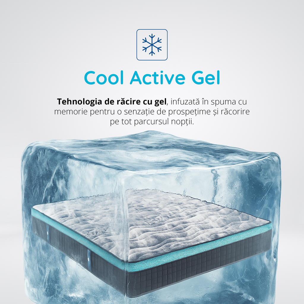 Tehnologie de ultimă generație care combină beneficiile spumei cu memorie cu efectul de răcorire activă al particulelor de gel. Aceasta reglează temperatura corpului, reduce acumularea de căldură și oferă o senzație de prospețime și relaxare pe întreaga durată a somnului.