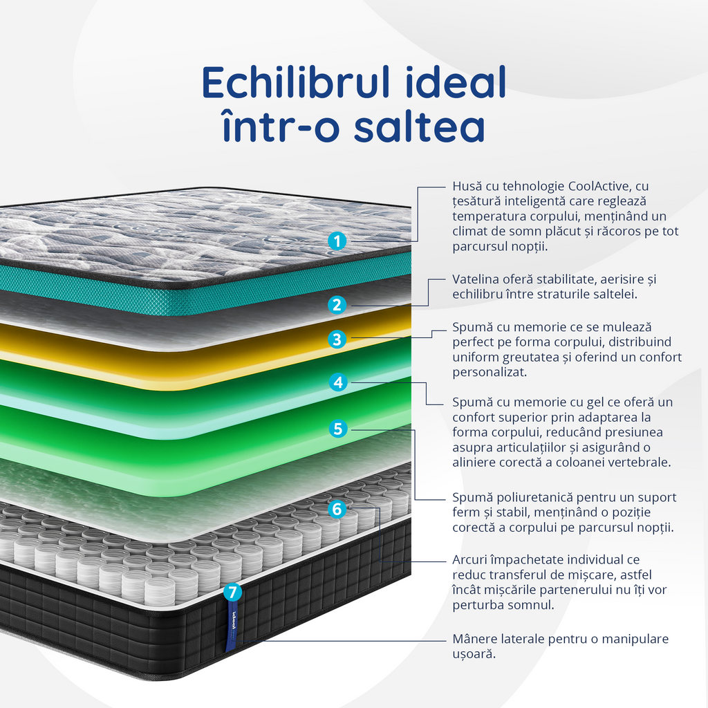 Sistemul premium de arcuri împachetate individual și straturile de spumă cu memorie Cool Gel lucrează împreună pentru a asigura echilibru, stabilitate și confort personalizat, indiferent de poziția de somn.
