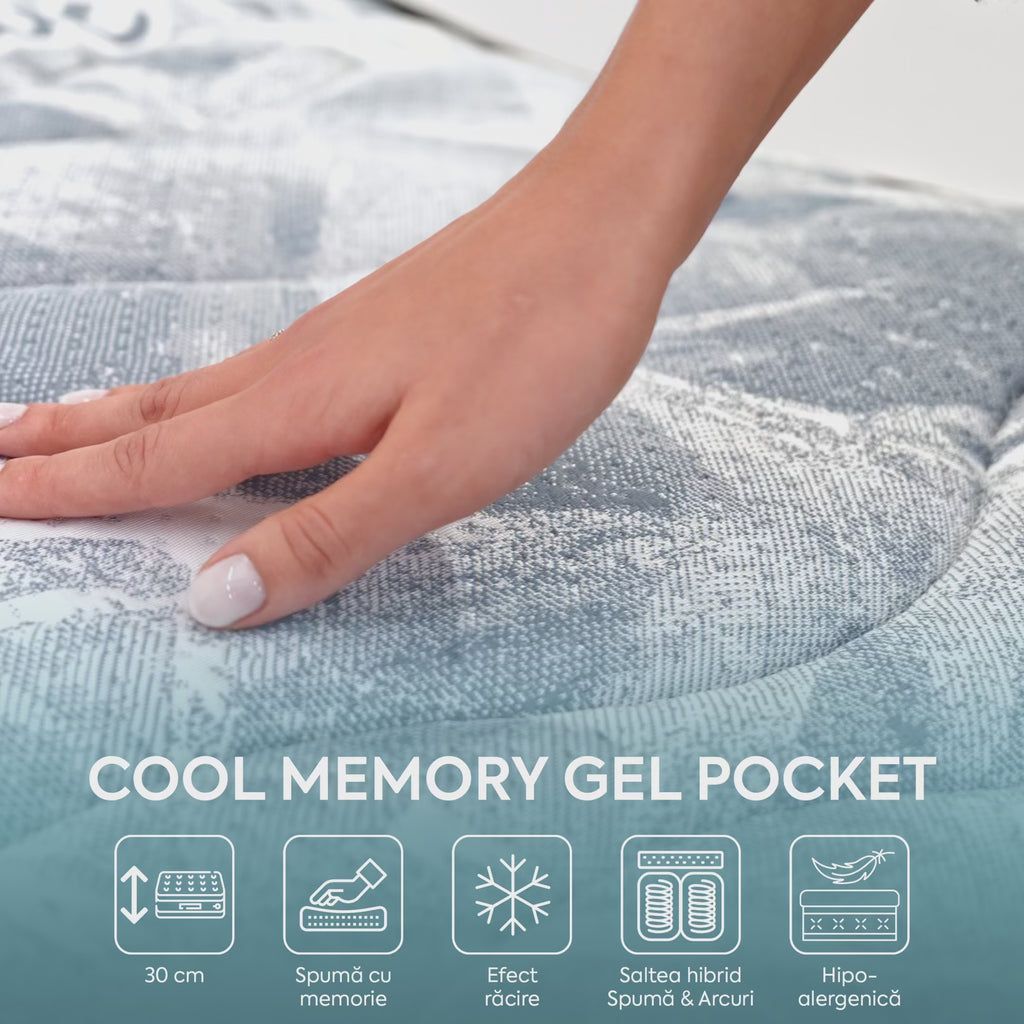 Tehnologie de ultimă generație care combină beneficiile spumei cu memorie cu efectul de răcorire activă al particulelor de gel. Aceasta reglează temperatura corpului, reduce acumularea de căldură și oferă o senzație de prospețime și relaxare pe întreaga durată a somnului.