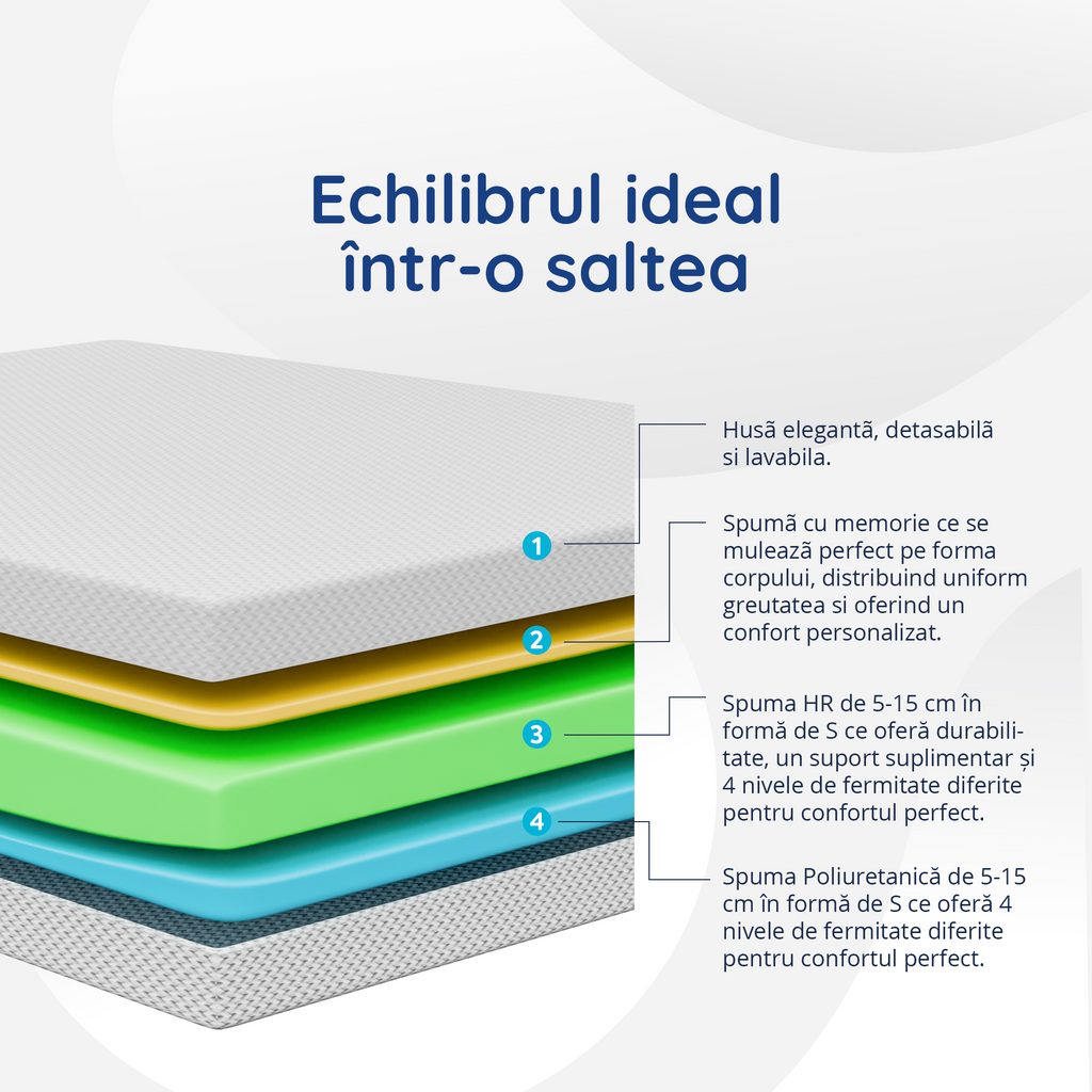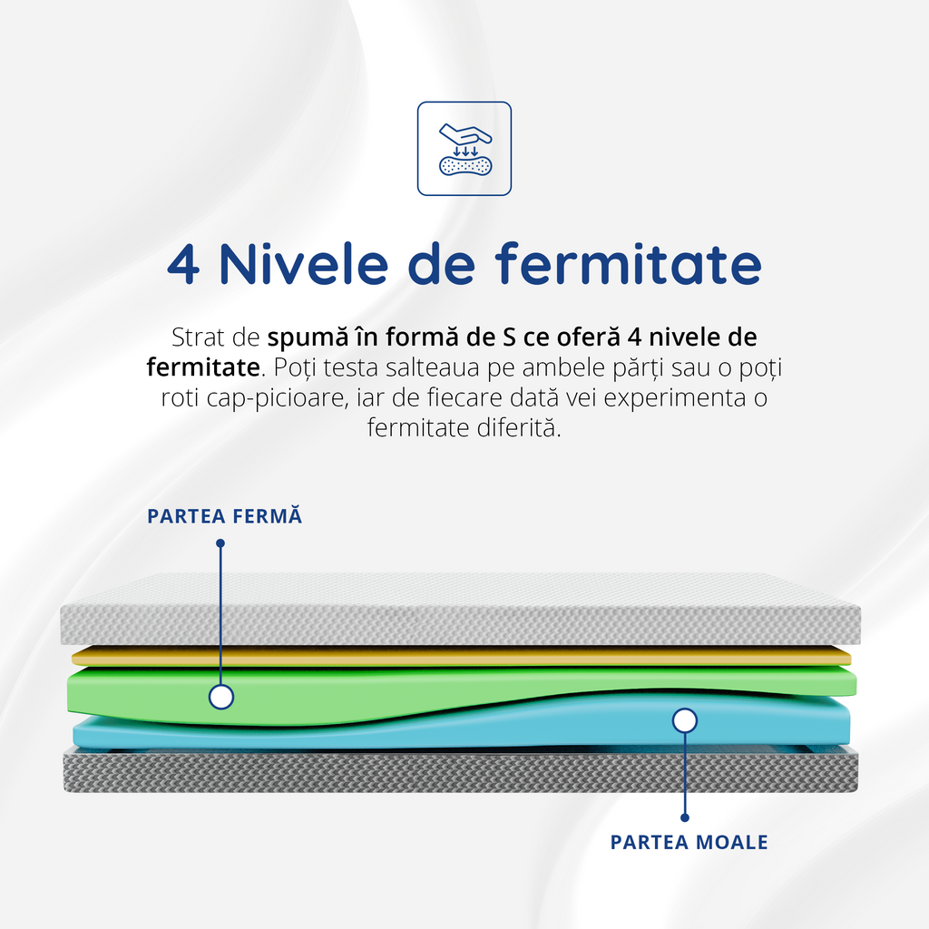 Rezultatul? O saltea modernă, adaptabilă oricărei preferințe, care transformă fiecare noapte într-o experiență de somn perfect echilibrată – 4 niveluri de confort, într-o singură saltea!